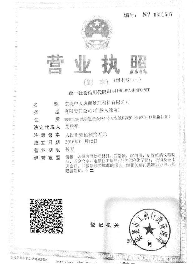 企业名称:东莞中天表面处理材料有限公司